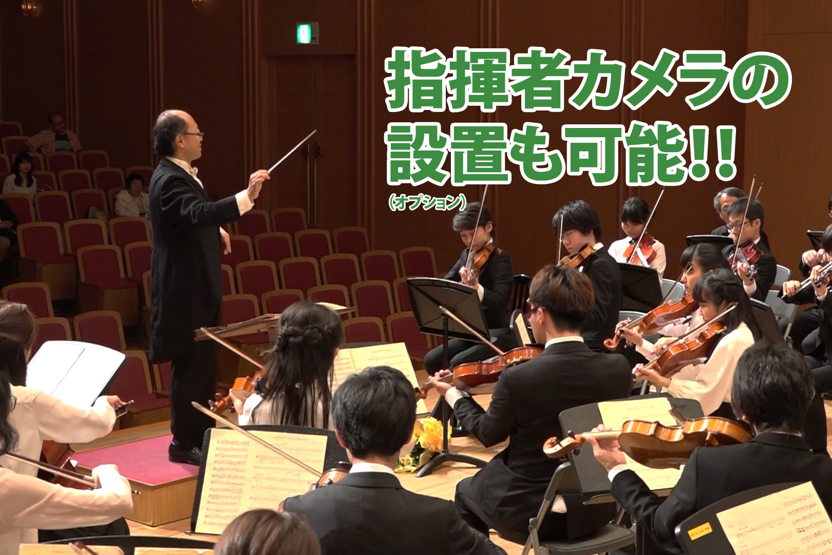 演奏会ビデオ撮影プランで最も人気の高いオプションが指揮者カメラ。指揮者カメラを設置することで指揮者の方の表情や動きがよりリアルに伝わり演奏の臨場感がさらに増します。また指揮者カメラは自動でズームすることも可能ですので曲に合わせて強弱をつけることも出来ます。