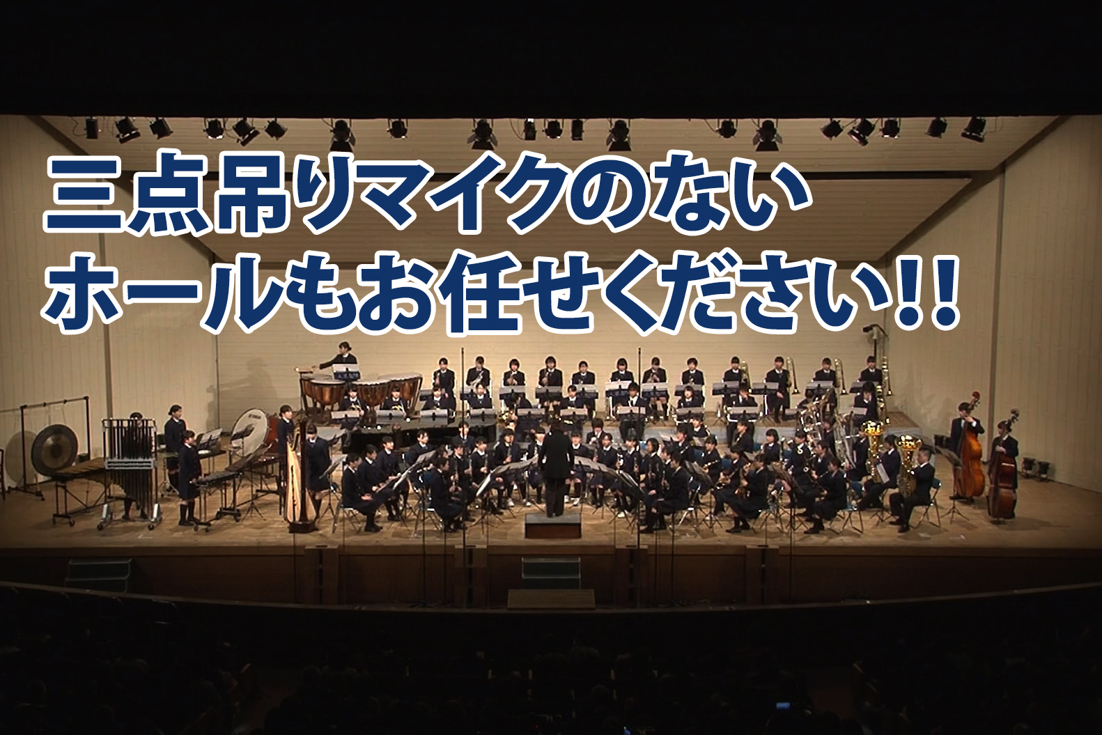 通常、ホールに設置してある三点吊りマイクを使用致しますが、三点吊りマイクがない会場でもマイクを設置することも可能ですので、高音質を確保することができます。